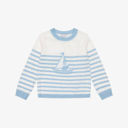 Little boys navy blue sweater by British heritage brand Beatrice & George. Exclusive to Childrensalon, it is knitted in a soft cashmere and Merino wool blend, with a red intarsia train across the front. It has long sleeves, cosy, ribbed trims and useful button fastenings on one shoulder.