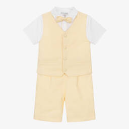 Exclusive to Childrensalon, this pale yellow waistcoat suit for boys is by heritage brand Beatrice & George. Ideal for any special occasion and for a smart finishing touch, the white shirt has yellow piping and comes with a button-on, detachable bow tie. The shorts have an adjustable waist for a comfortable fit.