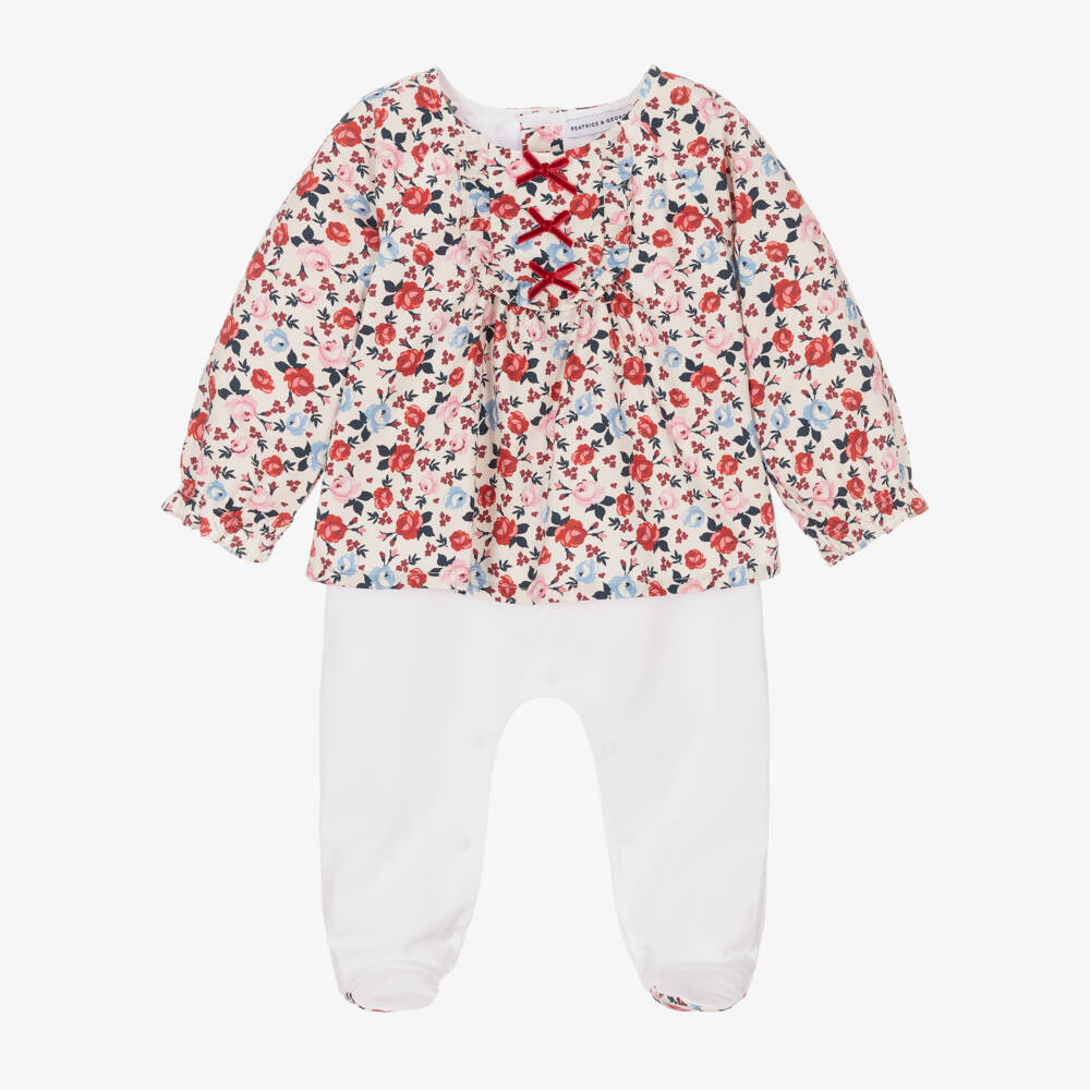 Exclusive to Childrensalon, an ivory and red cotton babygrow for girls by traditional brand Beatrice & George. With the appearance of a two piece, the organic poplin overlay has a lovely red, pink and blue floral print, with red velvet bow detailing on the frilled bib. It has gently elasticated, frilled cuffs and fastens around the back with buttons. The babygrow below is made in comfortable jersey, with popper fastenings between the legs.