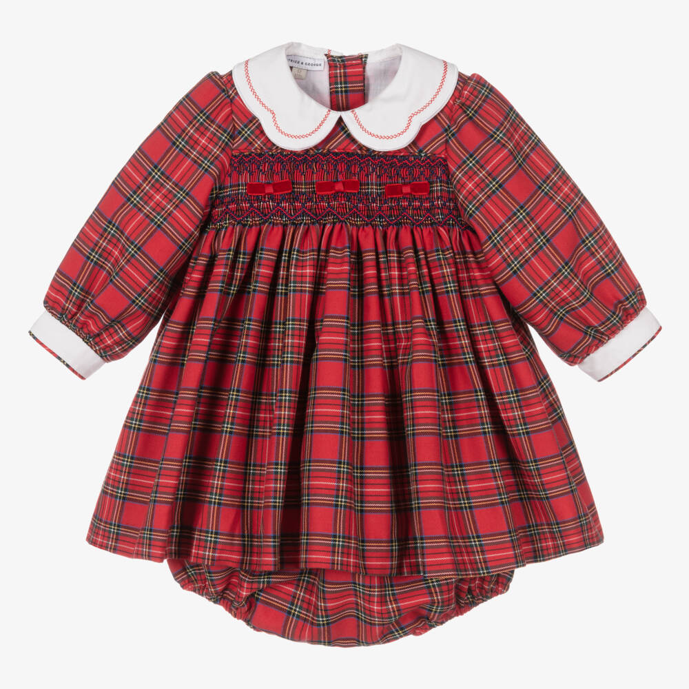 Red tartan dress for little girls by British heritage brand Beatrice & George, exclusive to Childrensalon. Traditional in style, it is beautifully smocked and embroidered across the bodice, with little red velvet bows. It has a white scalloped collar with red embroidery and full, puffed sleeves with white cuffs secured with buttons. There is a voile-lined bodice for comfort and it fastens with mother-of-pearl button fastenings on the back. It comes with useful matching bloomers.