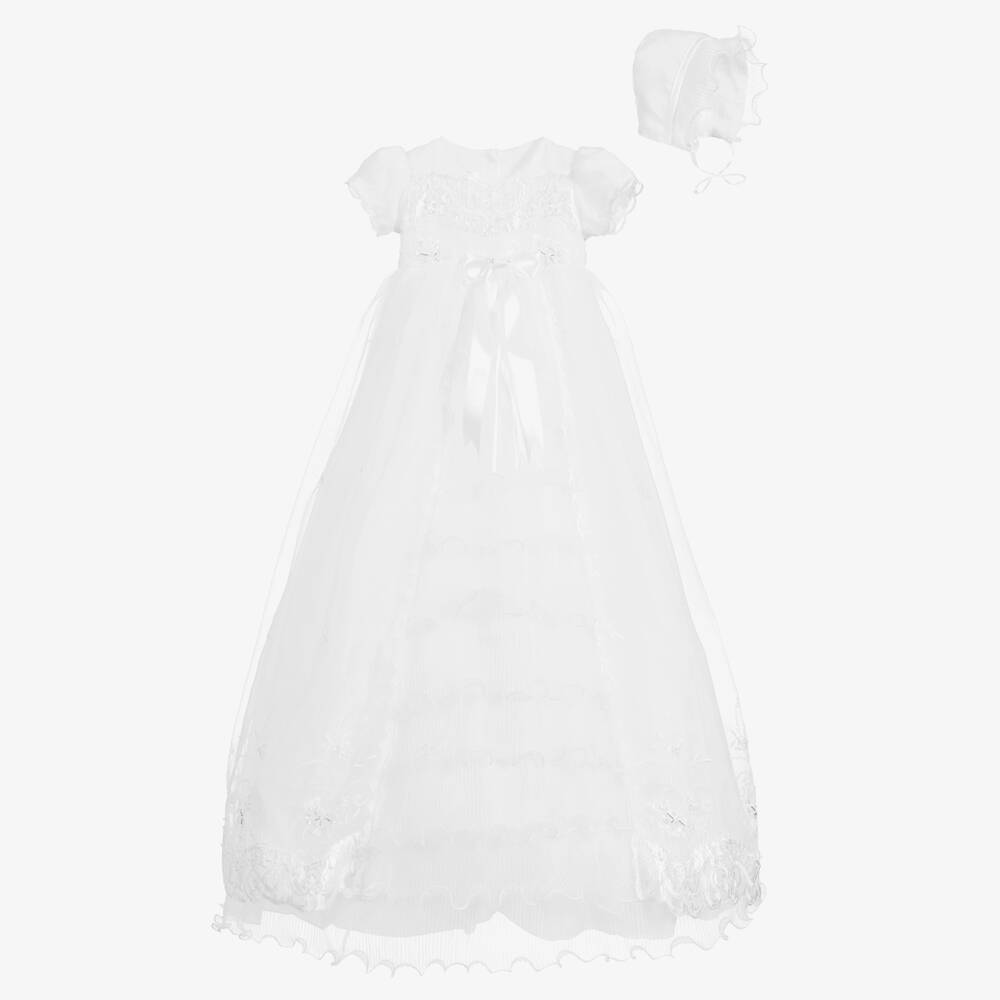 Baby girls white ceremony gown and bonnet set from Beau KiD. Made in soft organza with embroidered appliqués, beads and sequins. The long skirt has layers of lightweight organza with tiers of pleated frills in the middle and a wide satin sash. The matching lace bonnet ties under the chin.