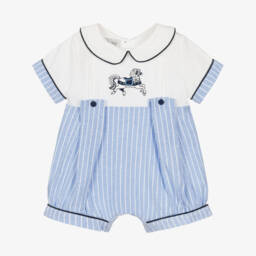 White shortie for baby girls by Beau KiD, with a pretty floral pattern in pink, green and yellow. Made in smooth cotton poplin, it has a scalloped collar and cuffs with yellow embroidered roses, and a faux button placket with pink decorative buttons. There is traditional smocking detail across the waist, with matching embroidered roses. This delightful babysuit fastens with buttons on the back and with poppers between the legs for easy dressing.