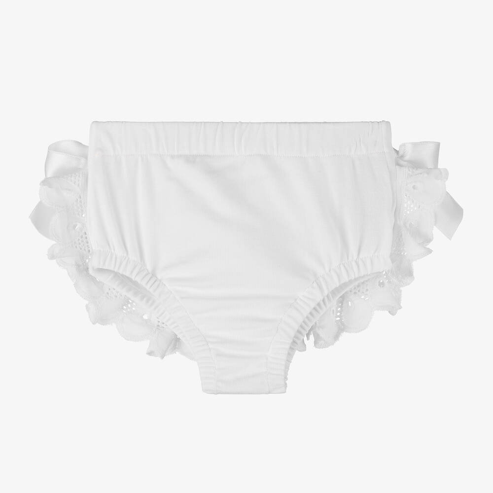 Baby girls white cotton bloomer shorts by Beau KiD. These cute lace-trimmed pants have satin ribbon bows and an organza frill, with a diamanté crown decoration on the back. They have an elasticated waistband and leg holes.