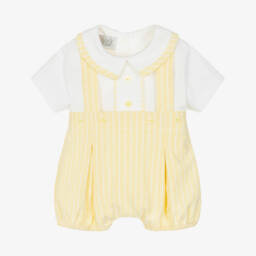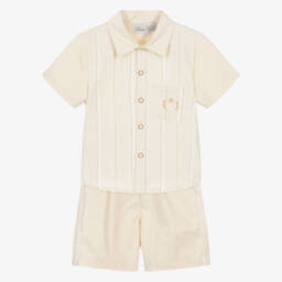 A white and beige shorts set for boys from Beau KiD, made in soft cotton. Cool and lightweight, the shorts are styled with slanted front pockets and faux back pockets. Easy to wear, they simply pull on. The jersey polo shirt has coordinating trims and an embroidered chest pocket to complete the classic look.