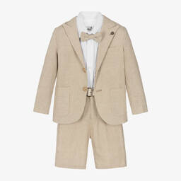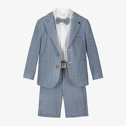 Smart blue and white shorts suit for boys by Beau KiD. Woven in mid-weight cotton, the jacket has a navy blue checkerboard lapel pin and a silky blue lining. The coordinating shorts have a useful adjustable waistband and come with a detachable beige woven belt. They have jetted front pockets and faux back pockets. The dressy white shirt is made in a silky cotton blend with a fine diamond jacquard texture. An adjustable, striped bow tie completes the set.