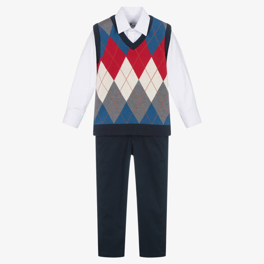 A smart-casual trouser set for boys by Beau KiD. The slipover is knitted in a soft cotton blend, with an elegant argyle pattern in blue, red, grey and ivory. The white shirt is woven in a comfortable cotton blend and has a pointed collar. The navy blue cotton twill trousers have front pockets, an adjustable waist for an ideal fit, and a button and zip fastening. They come with an adjustable faux leather belt which can also be worn with other trousers.