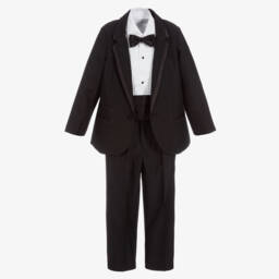 Boys white, special occasion, five-piece tuxedo by Beau KiD. The jacket and trousers have a satin trim, matching the cummerbund and bow tie. The white polycotton shirt has pin tucks on the front and two sets of button fastenings, one set is in pearlised white and can be removed.