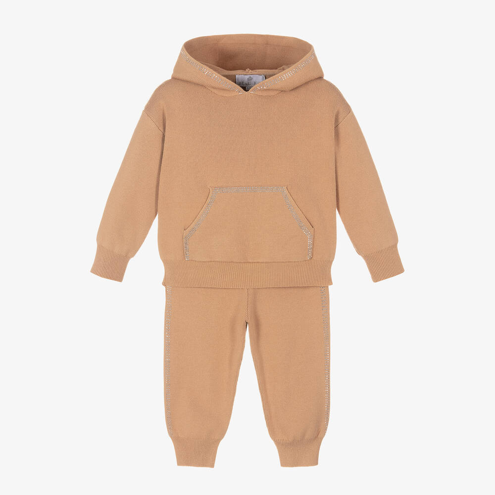 With stand out style, this pretty beige hooded tracksuit for girls by Beau KiD sparkles with diamanté trims. Knitted in a super soft viscose blend, it has ribbed trims for extra cosiness and a useful pouch pocket on the front.