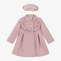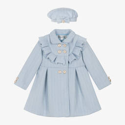A smart pastel blue coat and hat set for younger girls by Beau KiD, made in soft felted fabric with a stylish herringbone pattern. Detailed with a ruffle on the front and a button tab on the back, this traditional double-breasted style has a small collar and pleated skirt for a full shape. It is lined in blue satin and has lovely gold and white enamel crest buttons for a decorative touch. A matching beret-style hat completes the look.