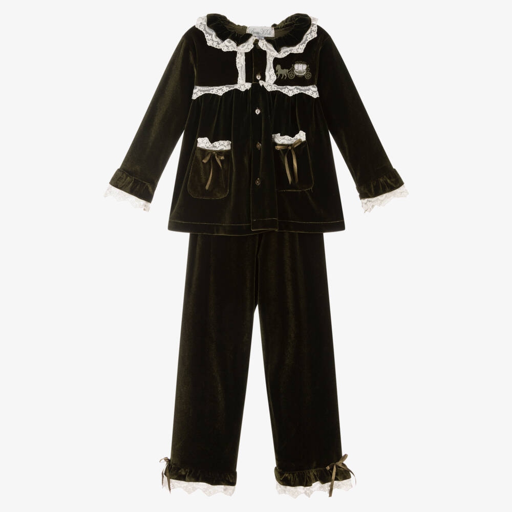 Olive green velvet pyjamas for girls from Beau KiD, with delicately embroidered white tulle trims. Traditionally styled, the button-up top has front pockets with satin bows and a horse and carriage embroidered on the chest. There is a frilly collar and a pretty bow appliqué on the back. The comfortable bottoms have an elasticated waist.