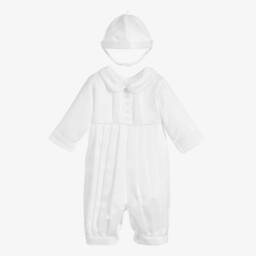 Pretty ivory floral shortie and headband set for baby girls by Beau KiD, made in soft, lightweight cotton. It has an ivory jersey bodice, with an ivory lace trim and pink satin bows. There are popper fastenings on the back and between the legs to help with easy dressing. A matching ivory jersey headband completes the cute set.