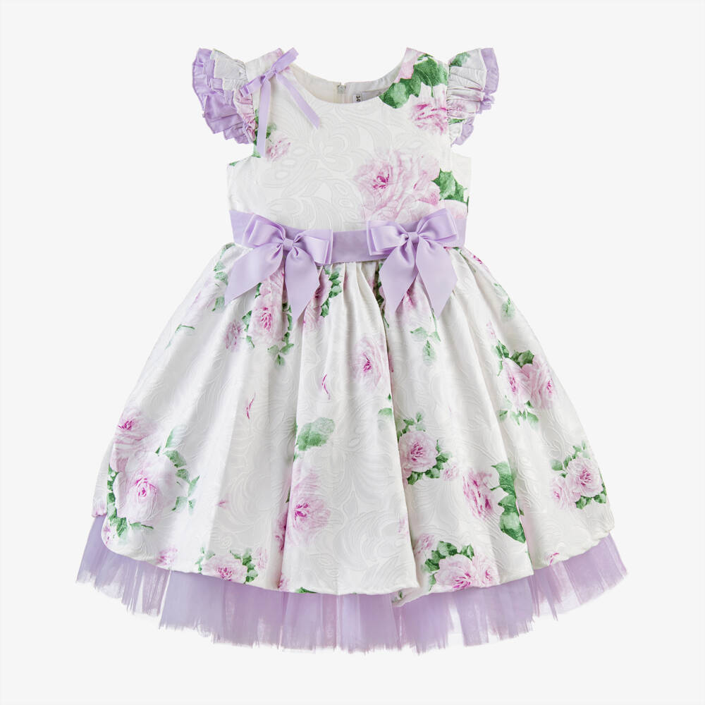 A charming white and lilac purple dress for girls by Beau KiD, made from silky jacquard fabric. Patterned with a pretty floral design, this dress has pretty frilled short sleeves and grosgrain ribbon bows on the front. Lined in lightweight voile, the full gathered skirt has subtle ruched detailing on the sides and tulle underlayers that peek out below the hem for a fairy-tale look. The waist ties loop through the bow decoration on the back that is secured in place with velcro, and there is a concealed zip fastening for a neat finish.