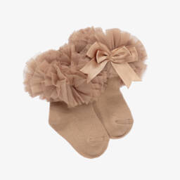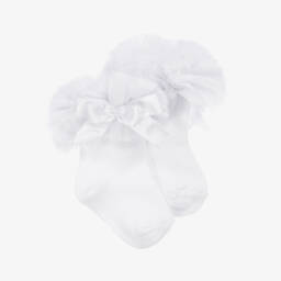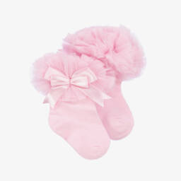 Pretty, pink cotton-rich ankle socks for little girls by Beau KiD. Soft and stretchy, each has a cute frilly tulle trim and a satin bow.
