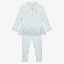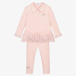 Stylish pale pink leggings set for girls by Beau KiD, ideal for elevating the every day. Made in soft, comfortable, cotton-blend jersey, the set includes a top with diamanté-embellished button fastenings and textured chiffon ruffles on the hem and cuffs. It has a sparkling diamanté bow on one side, which can also be found on one ankle of the coordinating, full length leggings.