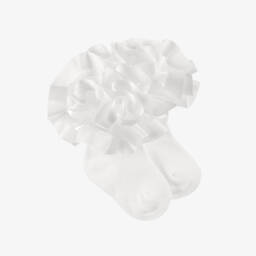 Girls white socks with large ruffle trims by Beau Kid. Finely knitted, they have elasticated cuffs so that the socks stay in place. The ruffles have a grosgrain trim and sheer organza panels for an elegant look.