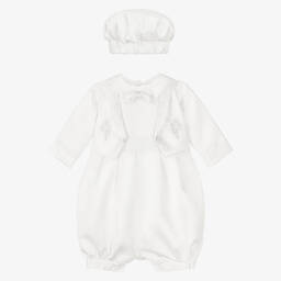 Baby boys ivory three piece babysuit set from Beau KiD. The shortie is made in soft satin, with an attached satin bow tie and button fastenings. The lined waistcoat is made in silky-feel satin, with a paisley pattern and covered button fastenings. It comes with a lined satin hat.