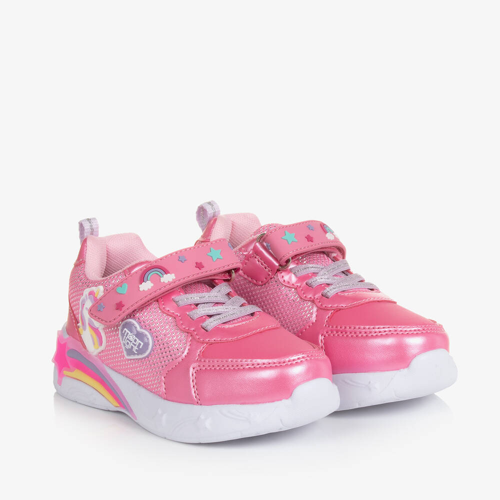 Cool pink trainers for younger girls by Beppi, made in soft mesh with faux leather trims. They have a mesh lining and cushioned insoles for comfortable, everyday wear, with faux laces and logo branding on the tongue. There is a rubberised unicorn on the side and colourful rainbows, stars and hearts on the velcro-fastening strap. The brightly coloured rainbow design on the side has a built-in LED light, which lights up when walking. The fun star-patterned outer soles are non-slip for added grip.