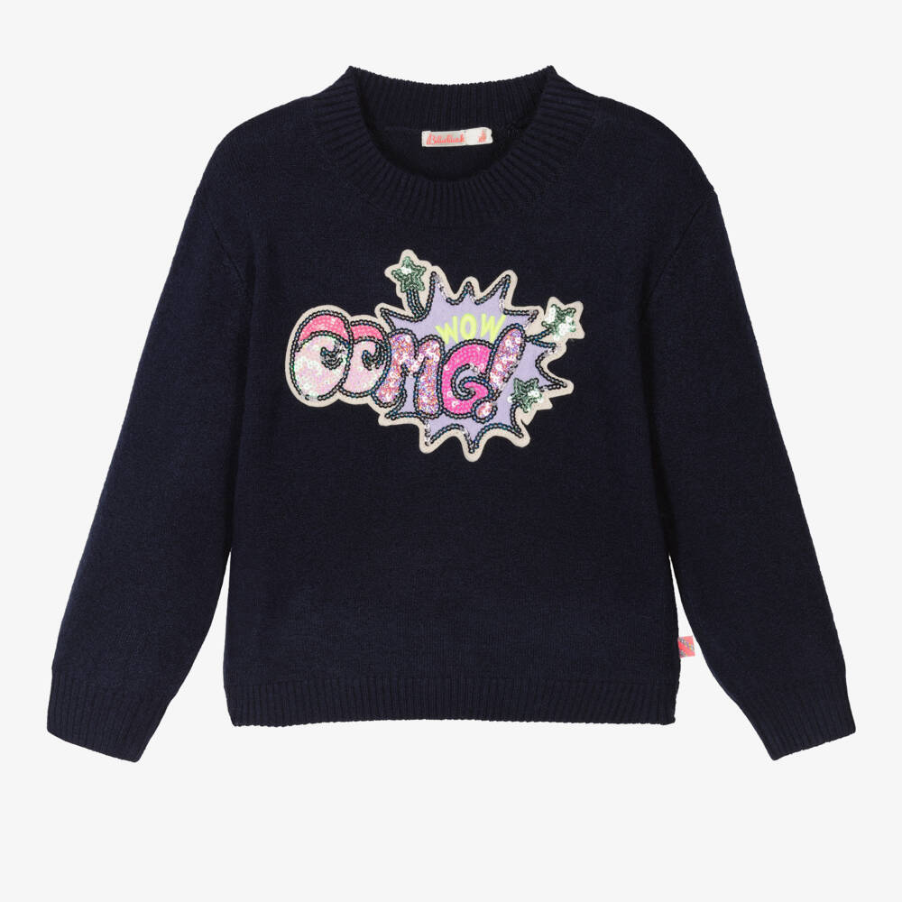 A fun and playful navy blue sweater for girls by Billieblush. It features an eye-catching 'OMG' star and eye design on the front, in colourful and iridescent sequins. Cosy and comfy, the jumper is softly knitted and has ribbed trims for snug feel. A signature striped tab on the side seam adds a subtle touch of branding.