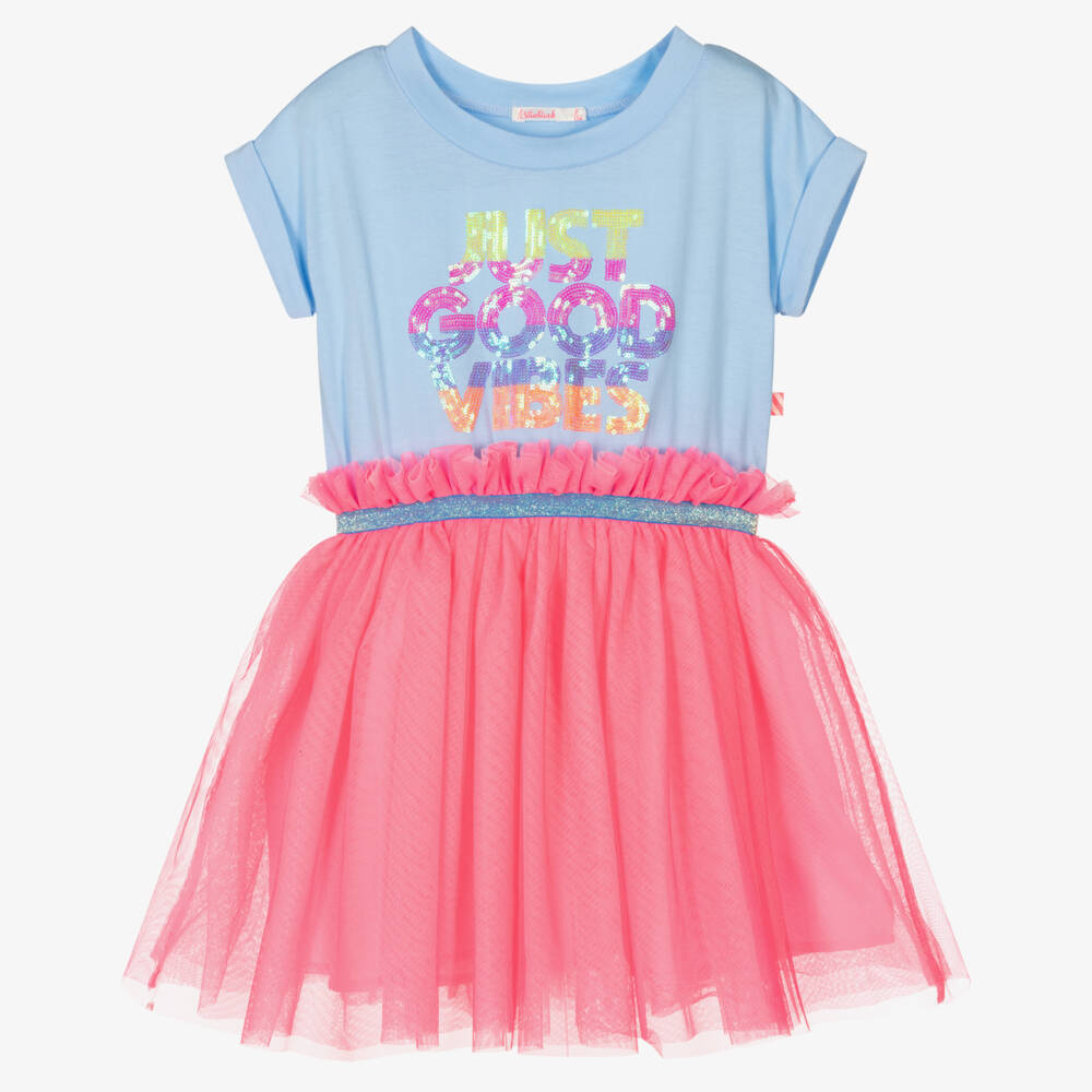 Fun dress for girls by Billieblush, with a 'Just Good Vibes' slogan shimmering in colourful sequins on the front. It has a pale blue bodice with cute turn-up cuffs, made in comfortable jersey. The gathered, neon pink tulle skirt has a stretchy, glittery blue waistband and is lined in pink voile for comfort. Easy to wear, it simply pulls on.