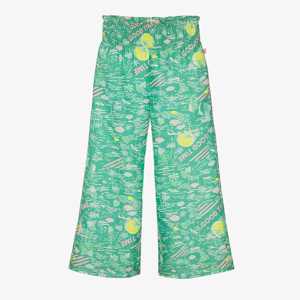 Beautiful green trousers for girls by designer Billieblush, made in soft and smooth sateen. They have a serene palm tree design printed all-over, with a 'Good Time' slogan and a sparkly tag logo on the side for a bright and playful style. Ideal for balmy summer days or chilling on the beach, they have a flowy wide leg and a comfortable shirred waistband.