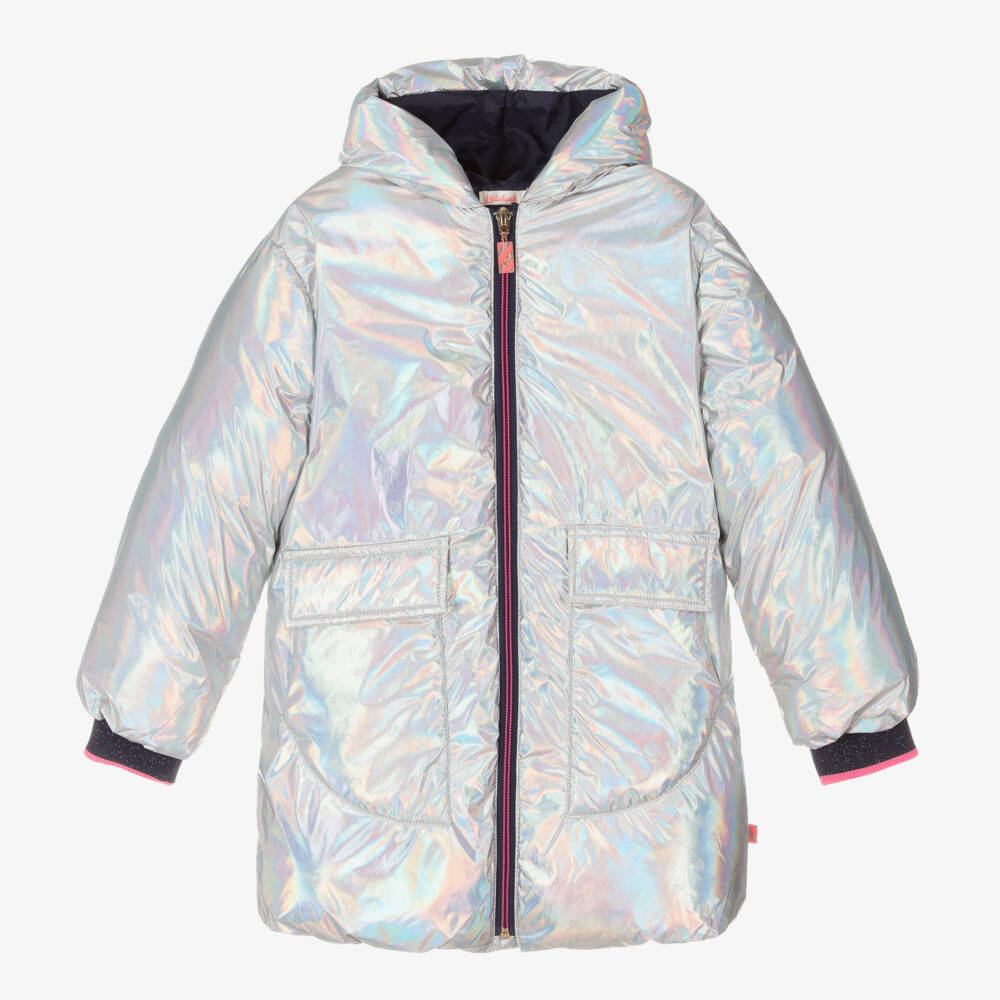 Iridescent silver hooded coat for girls by Billieblush, made in silky smooth and durable fabric with a tonal heart pattern. In a longline style, this mid-weight padded coat will keep little girls warm and snug on chilly days with an easy zip front, an elasticated hem, and glittery ribbed cuffs. Disguised with faux flap closures, the pockets on the front are ideally positioned to slip little hands into.