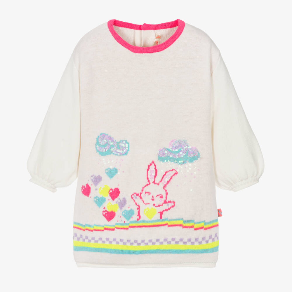 Fun and playful ivory sweater dress for little girls by Billieblush. This softly knitted piece has a bright bunny and heart intarsia design on the front, complete with sequin accents. It fastens with discreet popper fastenings on the back to allow for quick and easy dressing.