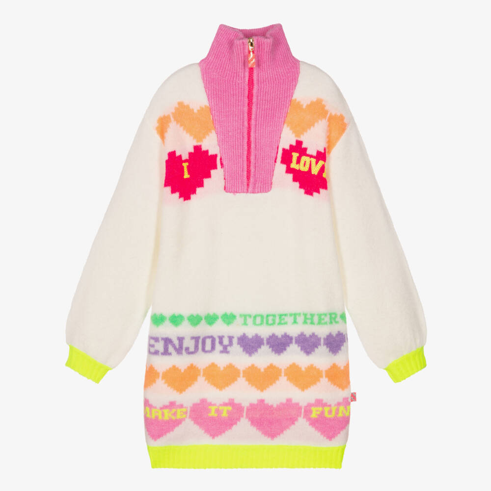 Girls will cosy up in style in this ivory sweater dress by Billieblush. In a beautifully soft knit, it has neon yellow trims and a signature pink turtleneck which opens with a half zip. There are positive slogans on the front, as well as multicoloured heart motifs and sequin decorations.