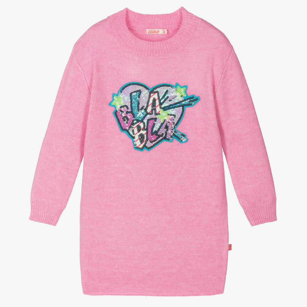 A fun and playful light pink dress for girls by Billieblush, made in a super soft knit. It has an eye-catching 'bla bla' appliqué on the front in bright and colourful sequins. Comfortable and cosy, this easy-to-wear dress, simply pulls on over the head, has a ribbed neckline and cuffs with a sparkly logo tab on one side seam adding a subtle designer touch.