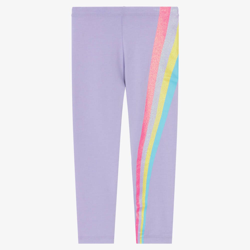 Lilac purple leggings for girls by Billieblush, made from soft and stretchy jersey. These full-length leggings have a glittery yellow, blue, and neon-pink striped design printed down one leg, for a fun and imaginative look.