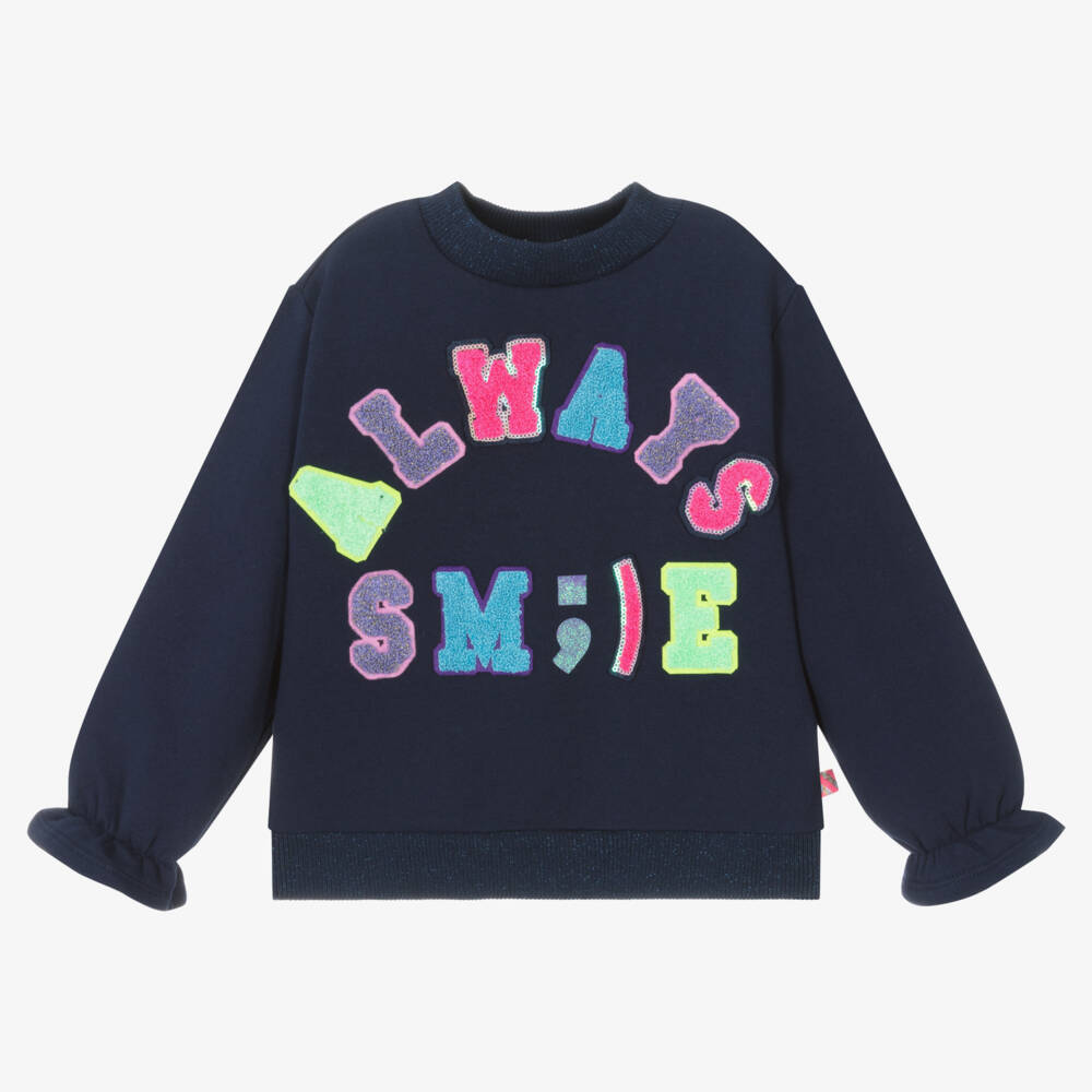 A navy blue sweatshirt for girls by Billieblush, with sparkly ribbed trims. Made from soft cotton jersey, this top has a neon-pink, blue, green, and purple 'always smile' design on the chest, constructed out of fun textured patches. The long sleeves have frilled, elasticated cuffs for an added feminine touch.