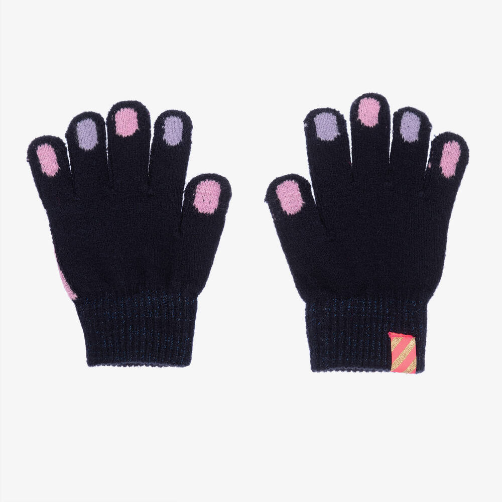 Navy blue gloves for girls by Billieblush, made in a soft knit. Warm and cosy, these fun gloves have matching halves of a pink heart on the back of each hand. The fingers have lilac purple and pink tips and the ribbed cuffs have a glittery blue effect.