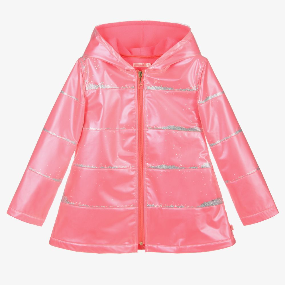 Fun hooded raincoat for girls by Billieblush, in soft neon pink fleece with a water-resistant polyurethane outer layer. There are shiny star and heart sequins between the layers and useful concealed side pockets.