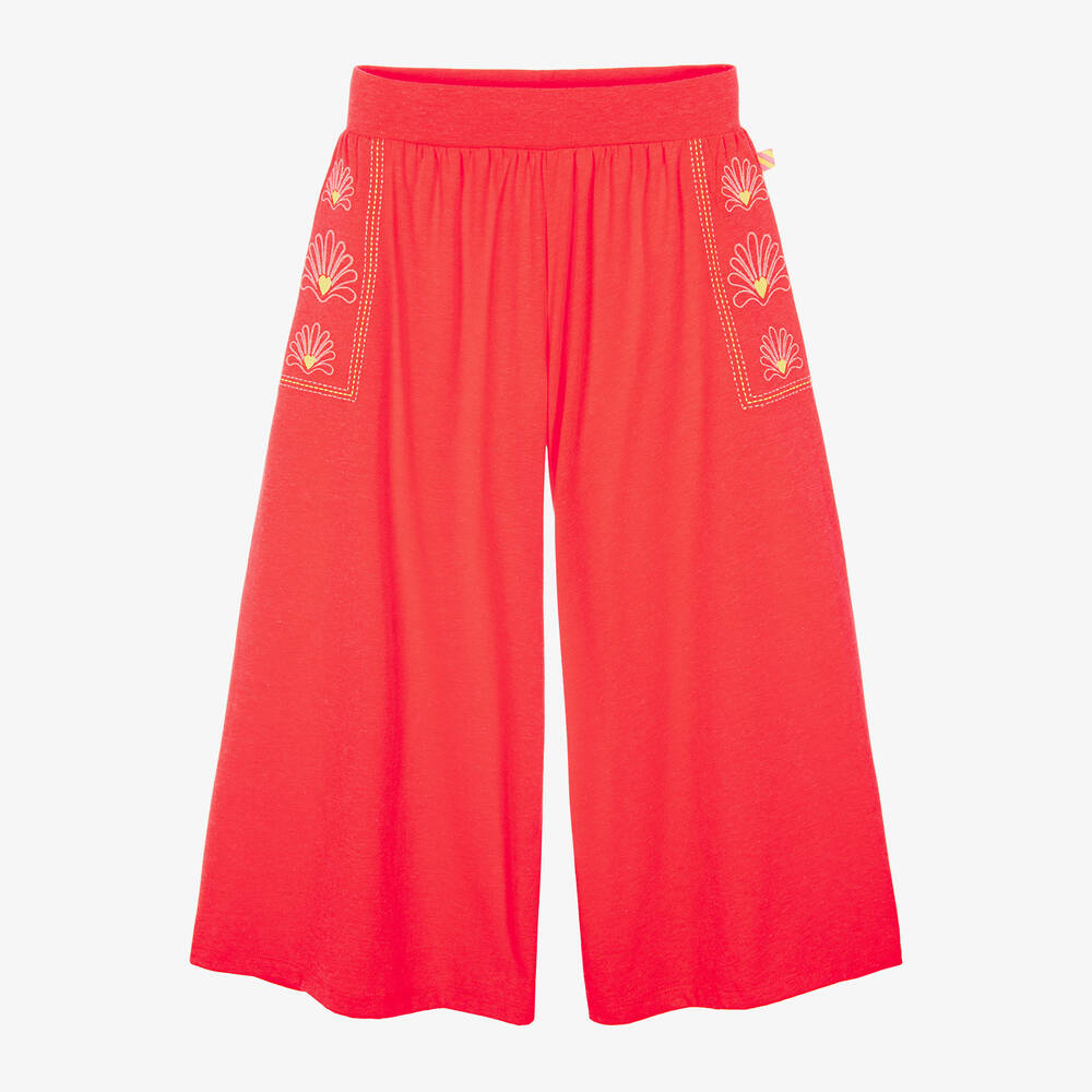 Кораллово-оранжевые брюки для девочек от Billieblush из мягкого хлопкового трикотажа. Эти широкие и свободные брюки имеют стильный крой и удобный эластичный пояс. Спереди вышиты красивые розовые ракушки и неоновые жёлтые сердечки, добавляющие игривости и веселья.