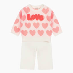 Beautiful and playful pink trouser set for little girls by Billieblush, made from a soft cotton-blend knit. The top has a colourful bunny and heart intarsia design on the front, complete with sequin embellishments. For a girly touch, it has an oversized neon pink collar with delicate pointelle detailing and scalloped edges. It fastens with discreet popper fastenings on the back to allow for quick and easy dressing. The fun top pairs with matching pale pink leggings, which have a gently elasticated waistband and a co-ordinated stripe and heart pattern on one leg, for a casual and colourful look.