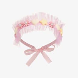 Summery pink hairband for girls by Billieblush, ideal for adding a little fun to an outfit. It has a large rosette on one side made in pink and yellow tulle, with iridescent white organza and a central ice cream appliqué. The flexible band is covered with glittery pink ribbon for extra sparkle.