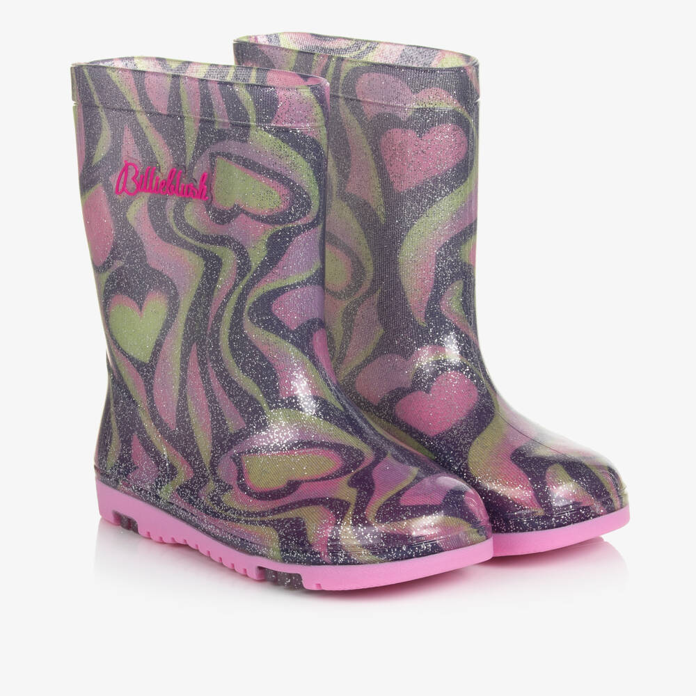 In a glittery pink, green and grey heart pattern, these fun and playful rain boots for girls are by Billieblush. They are made in smooth PVC and have a soft textile lining for comfort. There is a lightly padded removable insole, with a non-slip rubber sole for good grip. A bright pink logo on the sides adds a finishing designer touch.