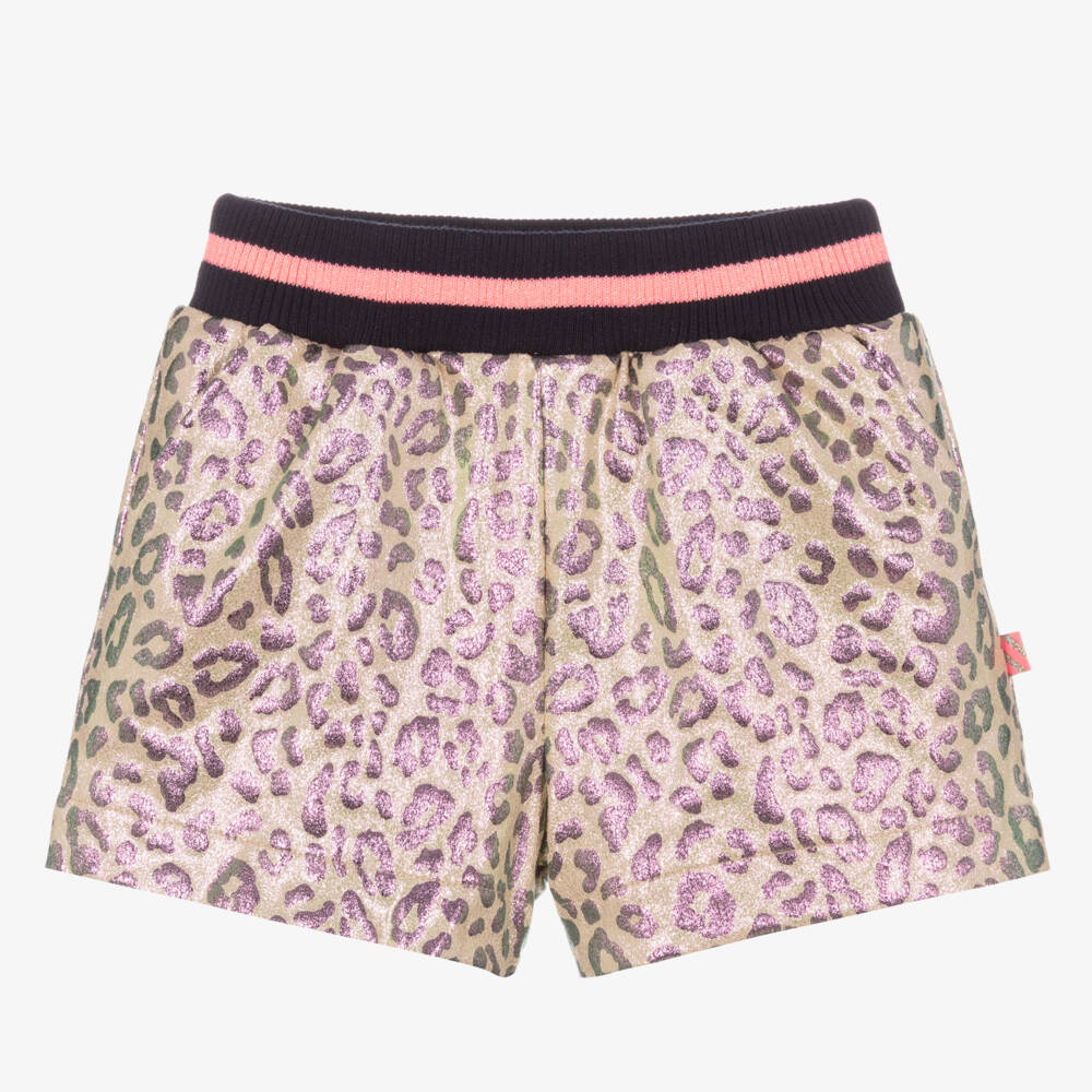 Fun pink leopard print shorts for girls by Billieblush. Made from soft faux leather, they have a navy blue and bright pink ribbed waistband which contrast against the pale pink iridescent fabric. There are two slanted side pockets.