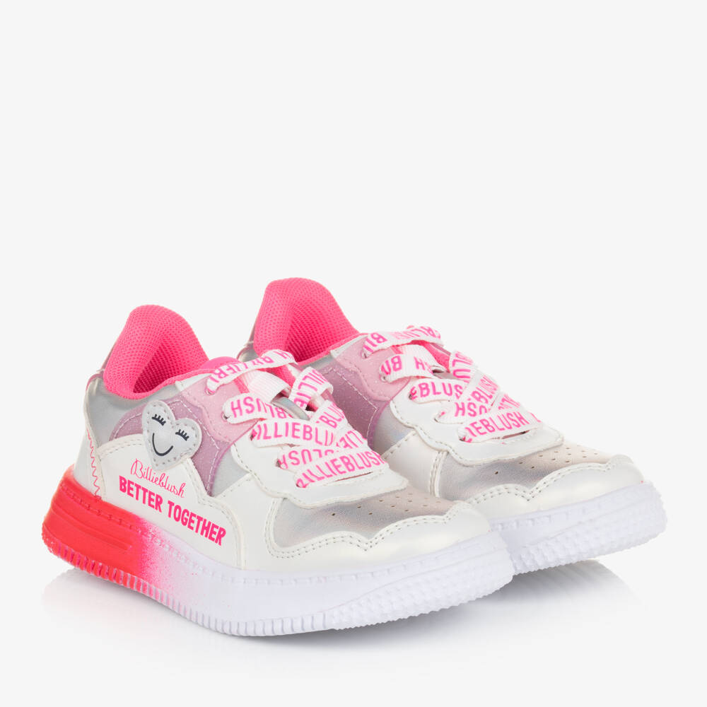 Super fun and girly, these bright pink and white faux leather trainers for girls are by Billieblush. Lined in mesh textile with a smooth leather insole, the uppers have holographic silver and pearly white panels with glittery pink trims. There is a 'better together' logo and smiling heart motif on the side, and breathable eyelets on the instep. They fasten with bold branded laces and the non-slip rubber outsole has a pretty pink-to-white gradient.
