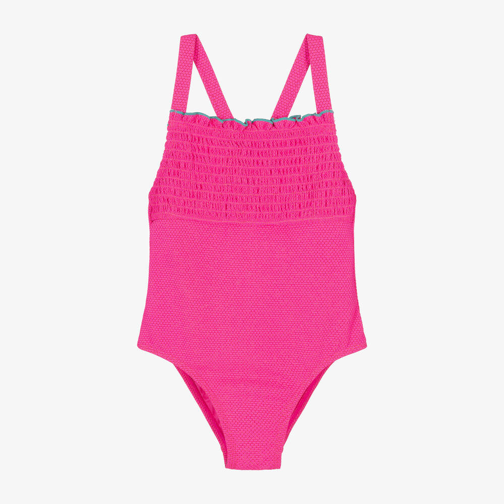 Lovely bright pink swimsuit for girls by Billieblush, made in a honeycomb textured fabric with shimmery gold detailing. It is styled with a low scooped back and a shirred panel across the chest with a teal blue edging on the ruffle. This stylish one-piece is fully lined for comfort and the straps are gently elasticated for a great fit.