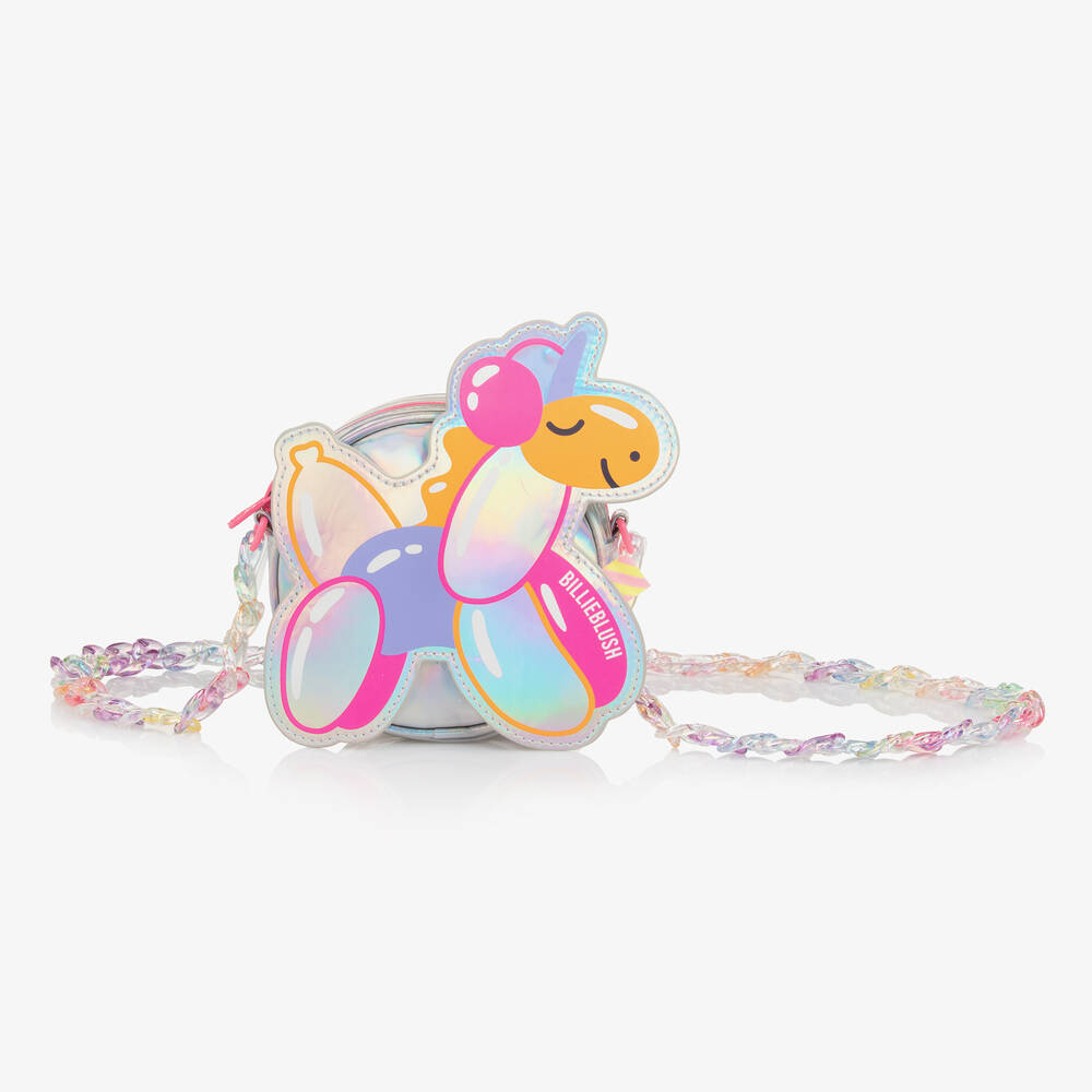 Silver shoulder bag for girls by Billieblush, made in a shiny, iridescent coated fabric. This cute bag has a fun balloon-style unicorn appliqué on the front and a pastel coloured, chain effect shoulder strap. Lined in smooth twill, it fastens across the top with a zip.