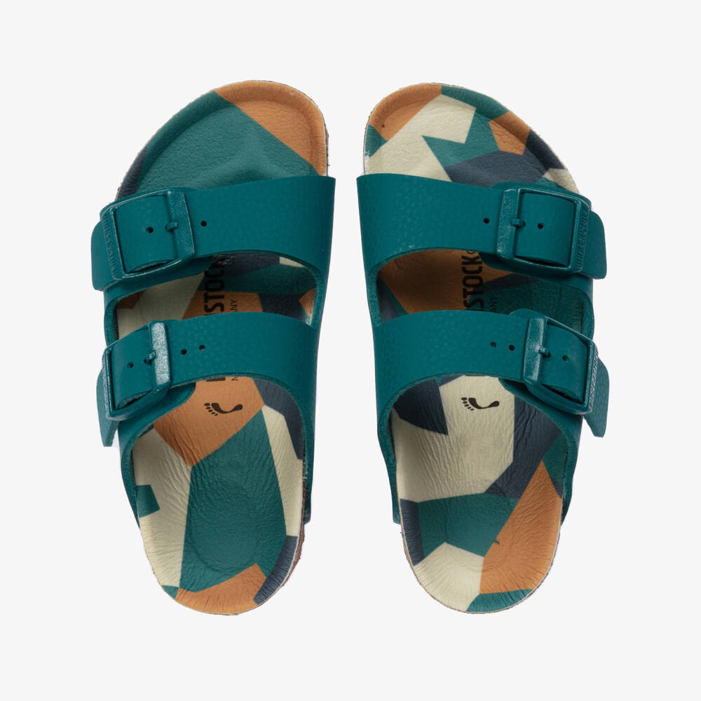 Teal blue sandals for boys by Birkenstock, made in soft faux leather. The moulded footbed has a playful camo print for a seasonal twist. Narrow fitting, they fasten with easy-to-use adjustable buckles across each foot for a great fit. The ridged outer sole is rubberised for improved grip.