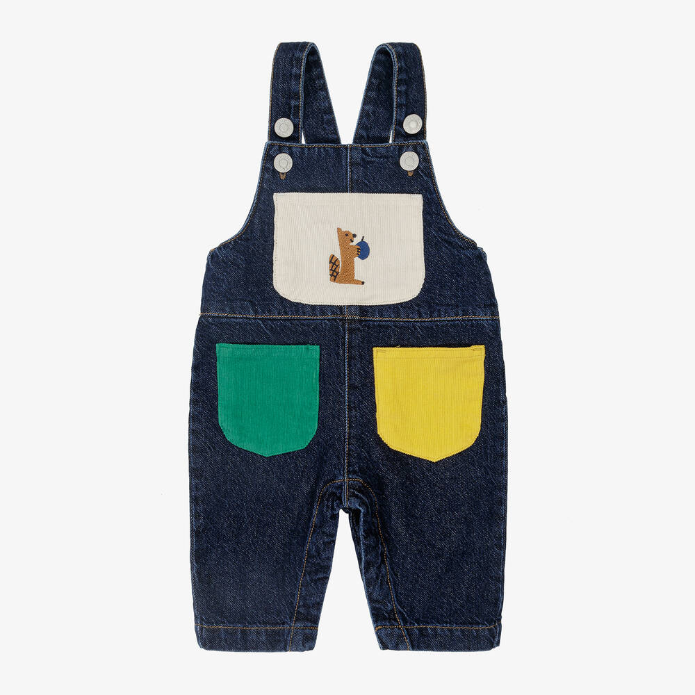 Очаровательный комбинезон для малышей и малышек от Bobo Choses. Барселонский бренд создал эти комбинезоны с забавными накладными карманами в цветовых блоках, коемового, желтого и зеленого цветов, один из которых украшен вышивкой белочки. Изготовлены из мягкого, неэластичного хлопка, застегиваются на кнопки между ножек и имеют удобные пуговицы на плечевых лямках.