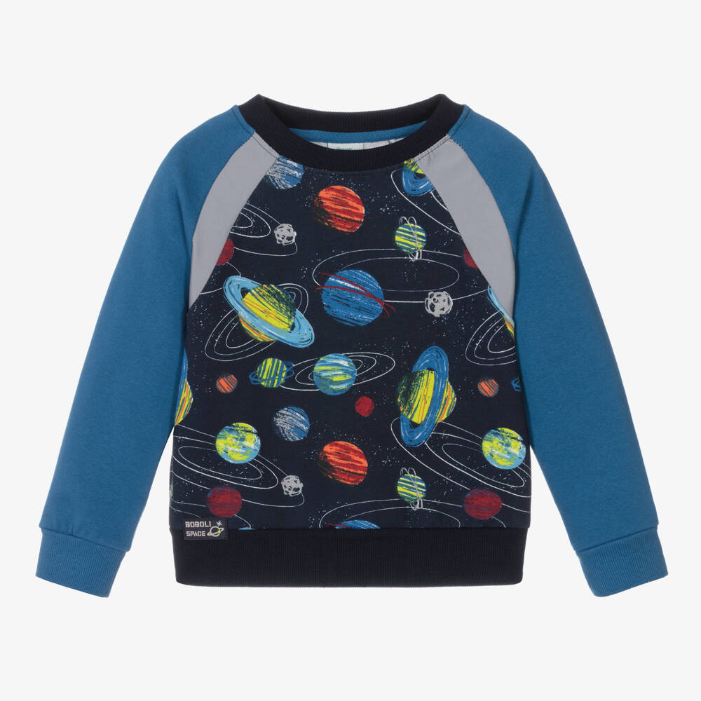 Eye-catching navy blue sweatshirt for boys from Boboli, with a colourful space-themed pattern. Made in comfortable mid-weight cotton jersey with a fleecy inside, it has contrasting bright blue sleeves and practical reflective panels on the raglan seams for improved visibility. There is a rubberised logo patch on the front to complete the look.