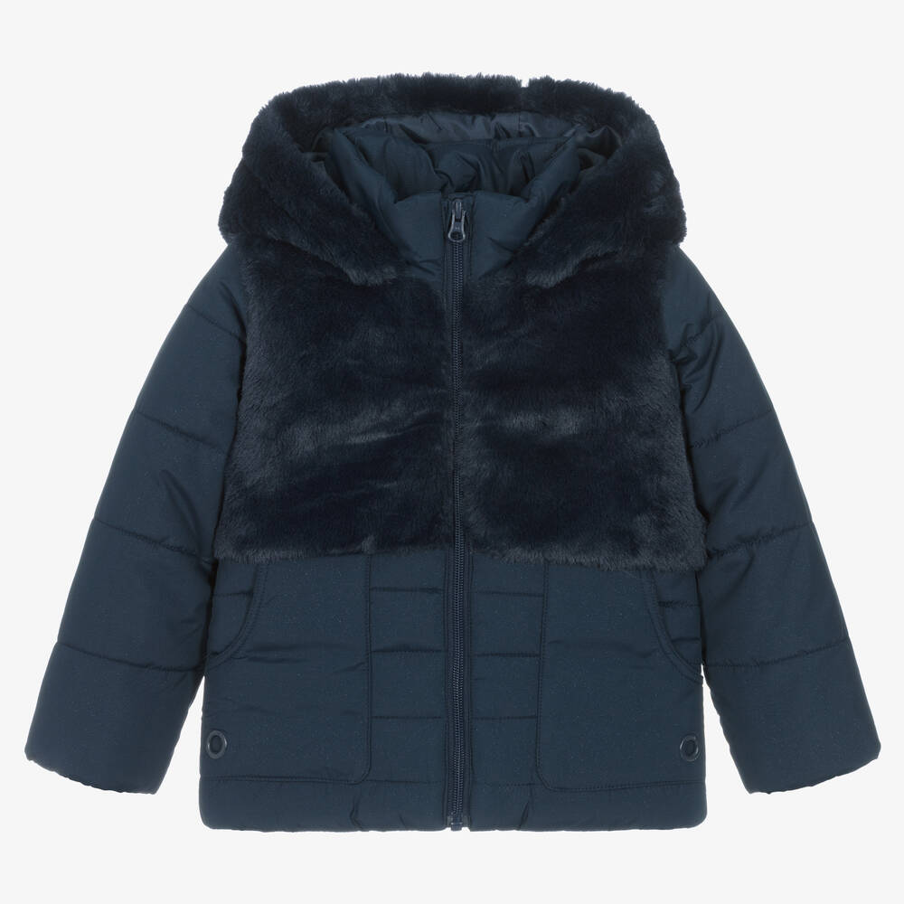 Lovely navy blue puffer coat for girls by Boboli, trimmed with beautifully soft, plush faux fur. The pockets on the front are fleece-lined to keep hands warm and cosy. It fastens with a smooth zip on the front and has a silky lining for comfort. There is a sweet, reflective slogan print on the back to improve your child's visibility.