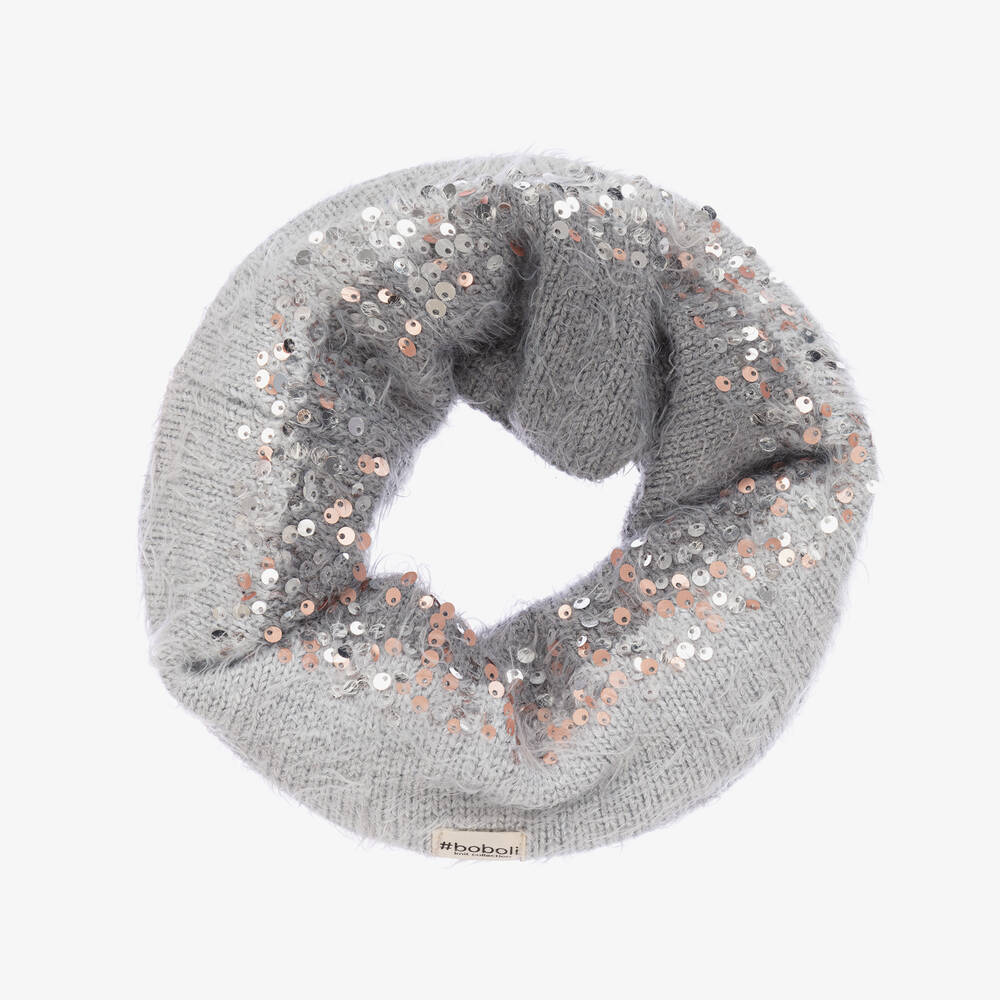 Мягкий и пушистый снуд для девочек от испанского бренда Boboli в комплементарных оттенках серого. Связан из хлопковой смеси с добавлением шерсти, имеет уютную плюшевую флисовую подкладку. Двусторонние пайетки серебряного и розового золота добавляют гламурного блеска, а логотип сбоку придает сдержанный фирменный акцент.