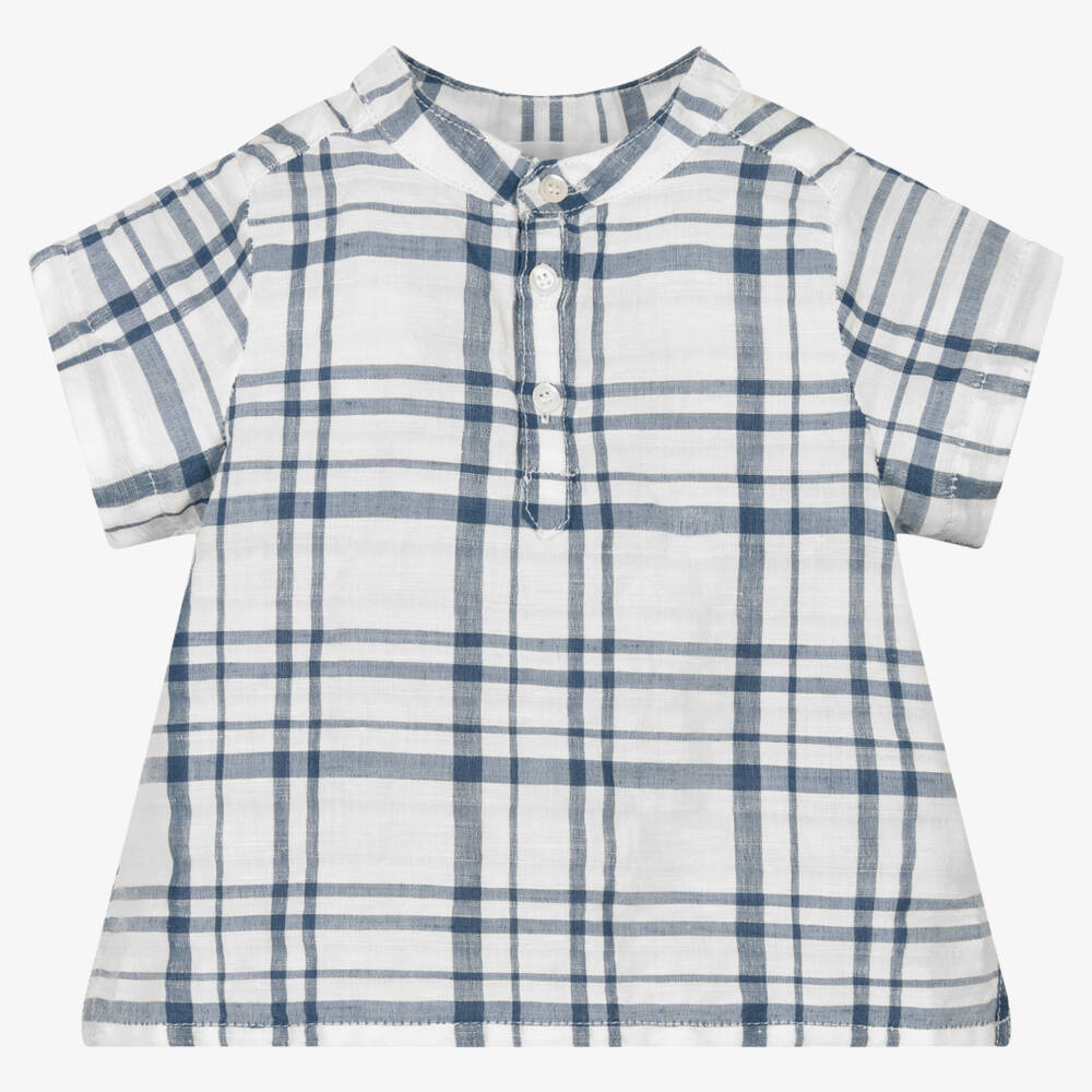 Baby boys blue and white checked shirt by luxury French brand, Bonpoint. Made in a soft linen and cotton blend, it is collarless and has part button fastenings on the front, for relaxed wear.
