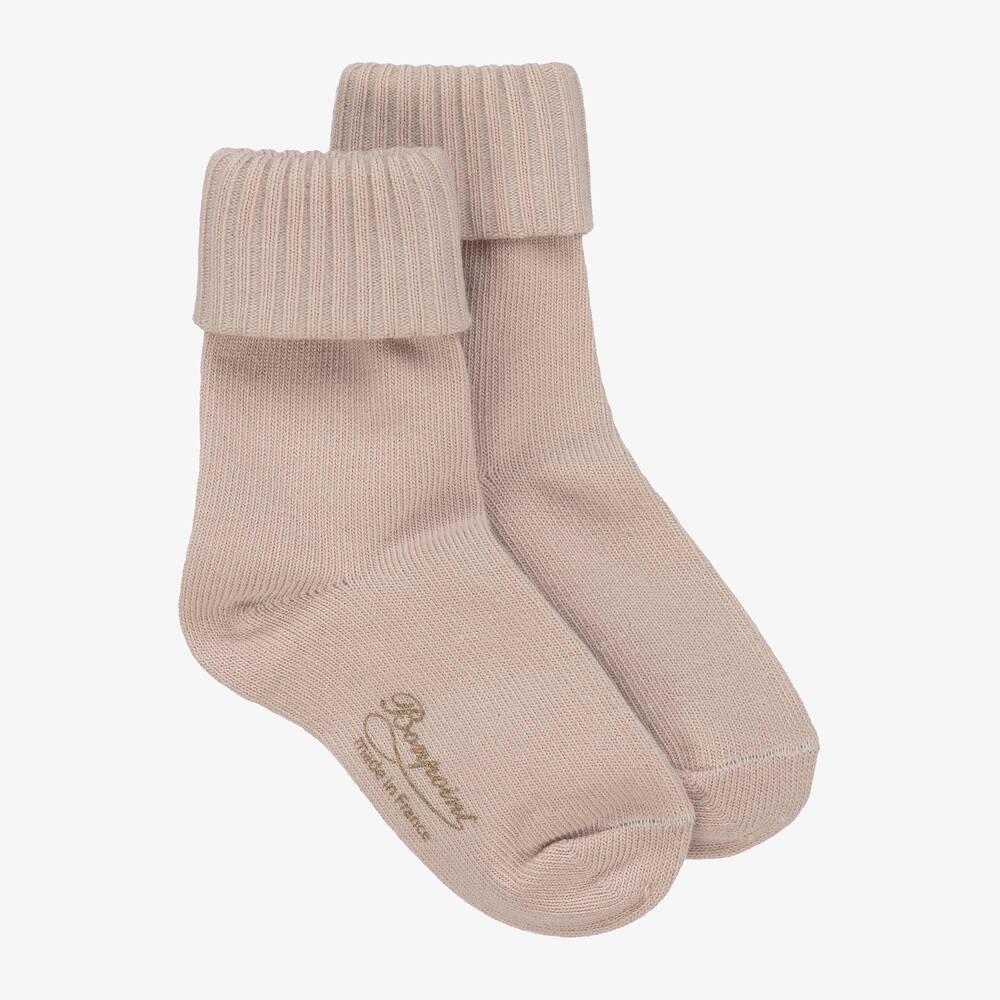 Soft and stretchy, beige socks for little boys and girls by French brand Bonpoint. They have ribbed cuffs and a brown logo print on the soles.
