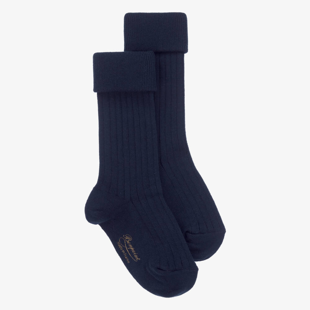 Navy blue cotton-rich socks for girls from luxury French brand, Bonpoint. Soft and stretchy, they have a classic ribbed pattern with turn-over cuffs and a gold logo print on the soles.