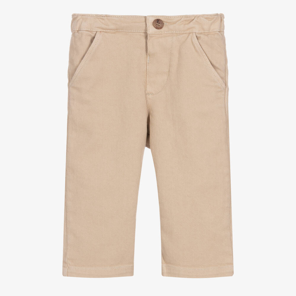 Little boys beige chino trousers by luxury French brand, Bonpoint. Made in soft, stretch cotton twill, they have classic side slant pockets, front button fastening and an elasticated waistband for comfort and fit.