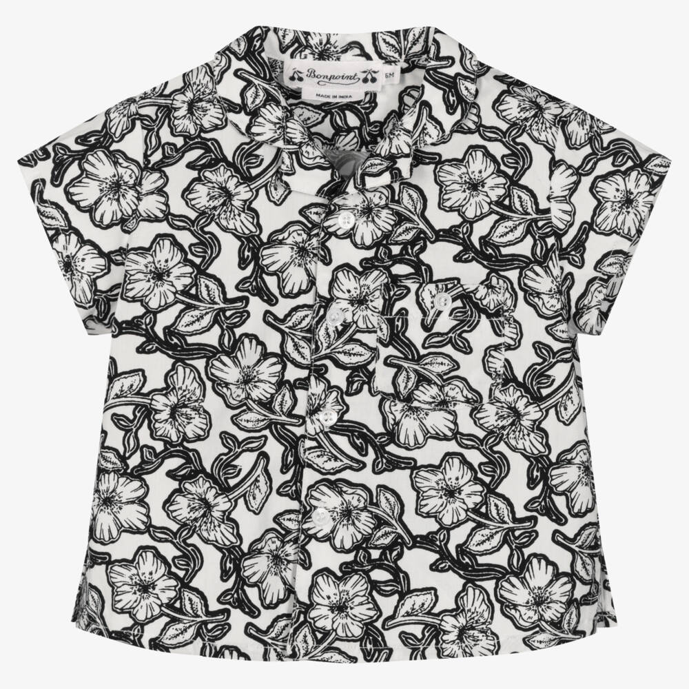 Little boys white and black floral shirt by luxury French brand, Bonpoint. Made in soft cotton poplin, it has a revere collar and mother-of-pearl front button fastenings, with a cute pocket at the chest.